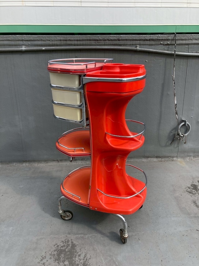 Size: W90/D37/H101 ・ Condition: B− (左下の棚表面傷,上部少し剥がれあります) ・ ポップなグラデーション配色が目を引く、マルチドロワーキャビネット。 イエロー&オレンジのカラー切替が空間のアクセントになりつつ、収納力もしっかり確保。キャスター付きでレイアウト変更もスムーズです。