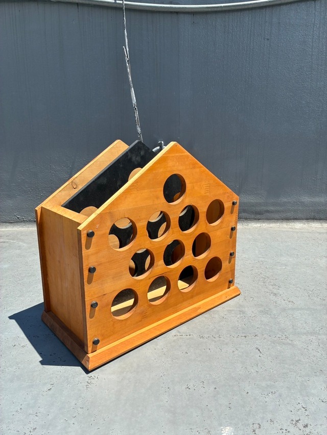 SIZE H42cm /W45cm /D22cm ・ CONDITION B ・ パンチングデザインが特徴的な木製マガジンラック。 三角屋根のようなシルエットで、まるで小さな家のような佇まい。丸穴はデザイン性だけでなく、抜け感と軽やかさを演出。雑誌やレコードの収納にぴったりなサイズ感で、空間のアクセントにも◎