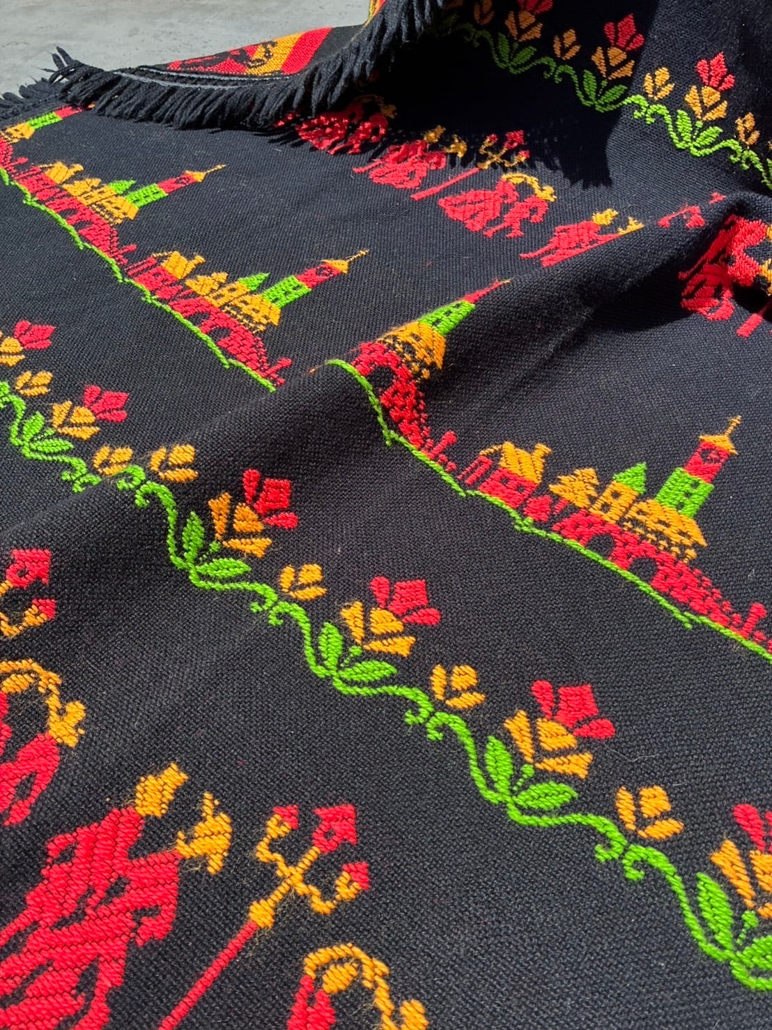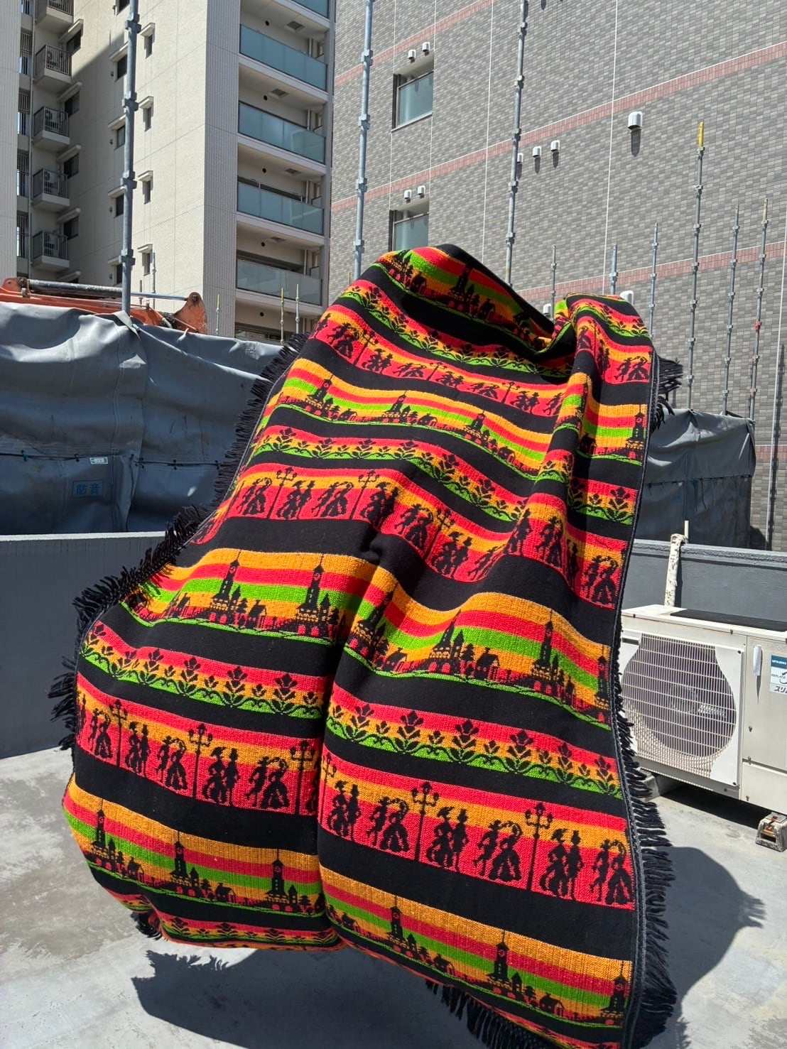 赤・黄・緑のラスタカラーに、民族調のダンサーや植物柄が大胆に織り込まれたエスニックラグ。裏表で柄が違うので気分で変えて良さそうです。大判サイズで空間にリズムとグルーヴを。