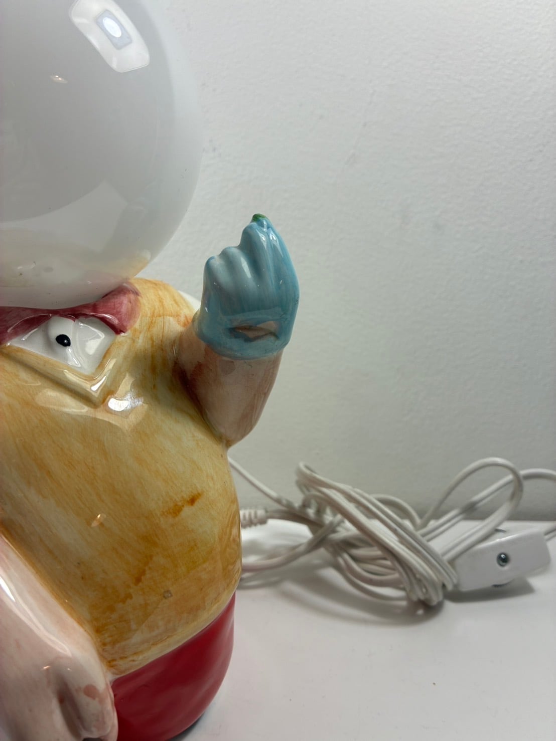 1980年代日本製のスペースエイジ・キャラクターランプ。胴体は陶器で造形され、頭部には大きなガラスグローブが光源としてセットされるユーモア性のあるアイテム。光を放つ姿は未来的でありながらどこか愛嬌も感じさせます。レトロフューチャーな雰囲気を空間に添える、80’sらしい遊び心あふれる一点。