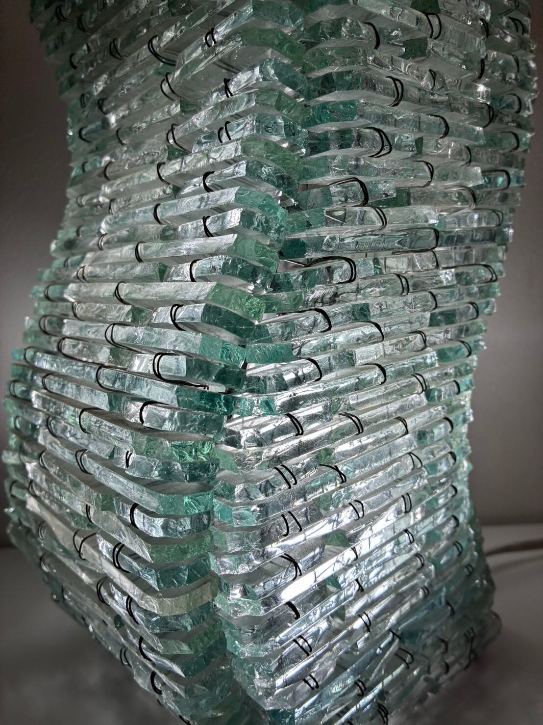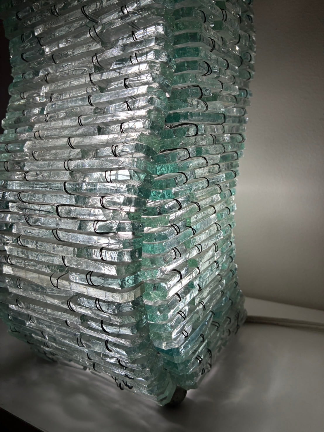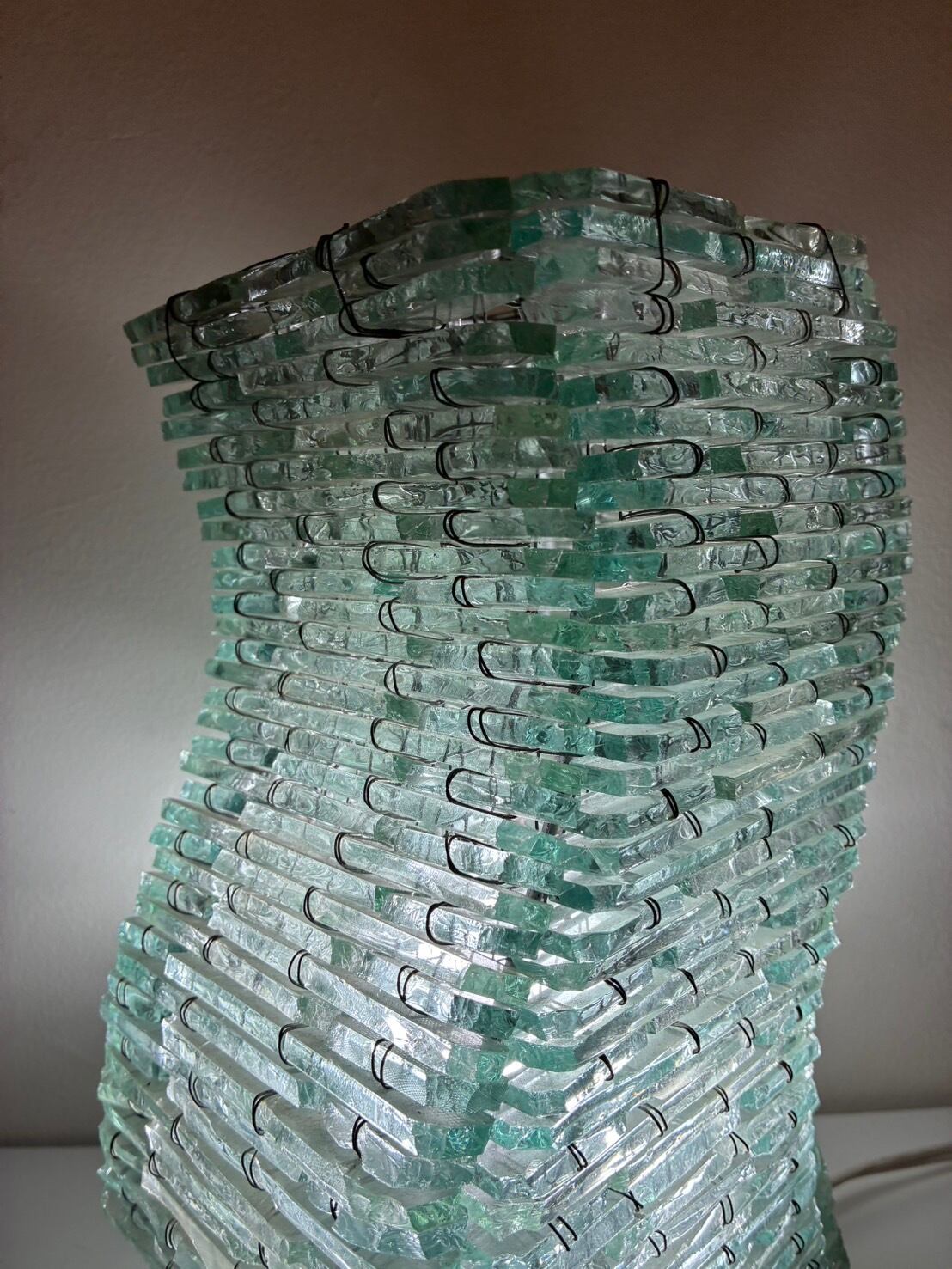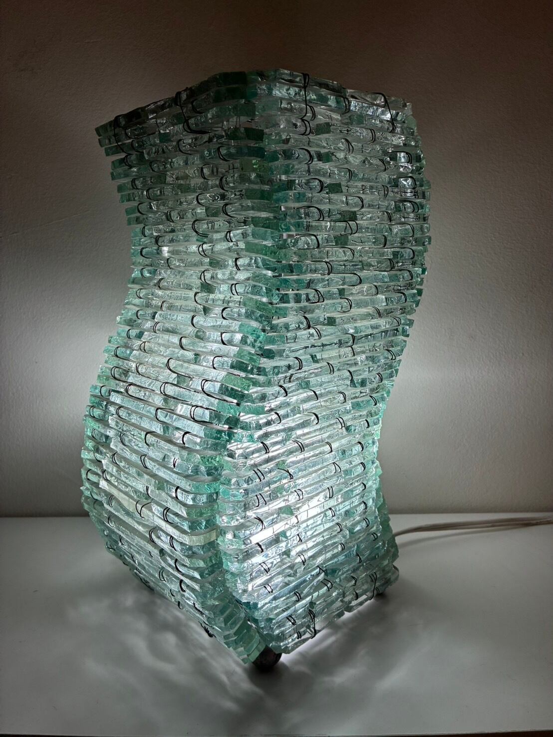 無数のガラス片を積層し、金属ワイヤーで束ねることで形作られた80年代頃のテーブルランプ。立体的で有機的なフォルムは、光を反射・透過しながら波打つような陰影を生み出します。彫刻作品のような存在感を兼ね備え、空間を幻想的に演出する1台。リコメンドアイテムです。