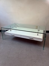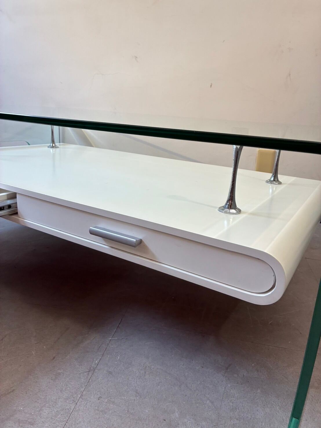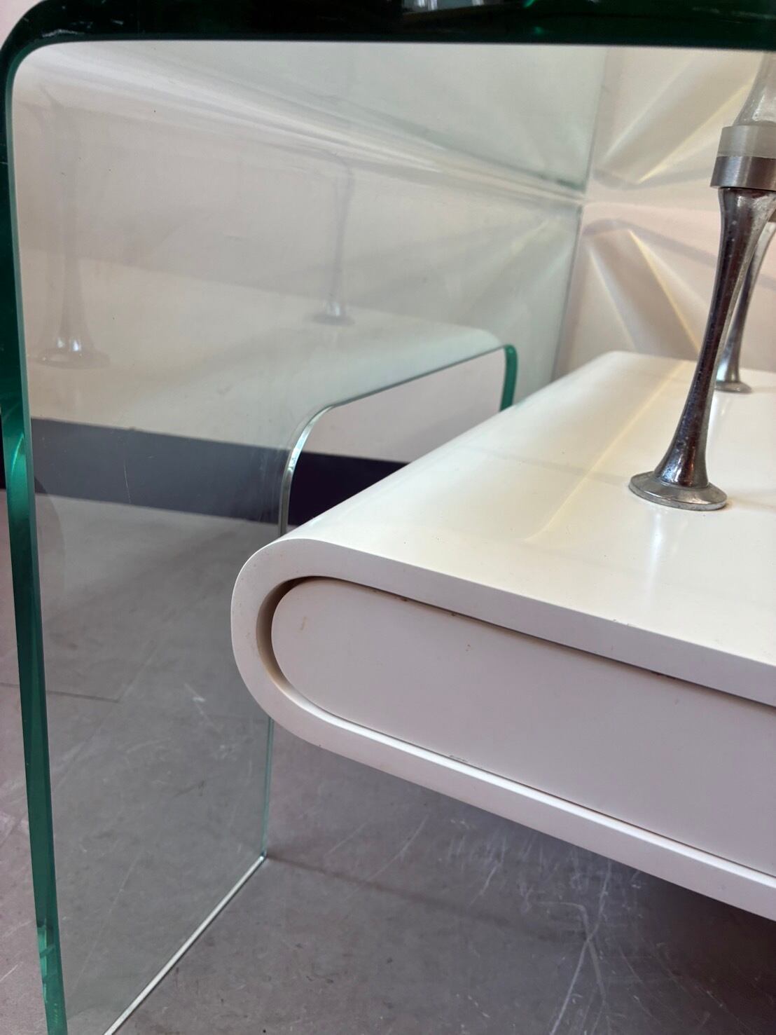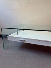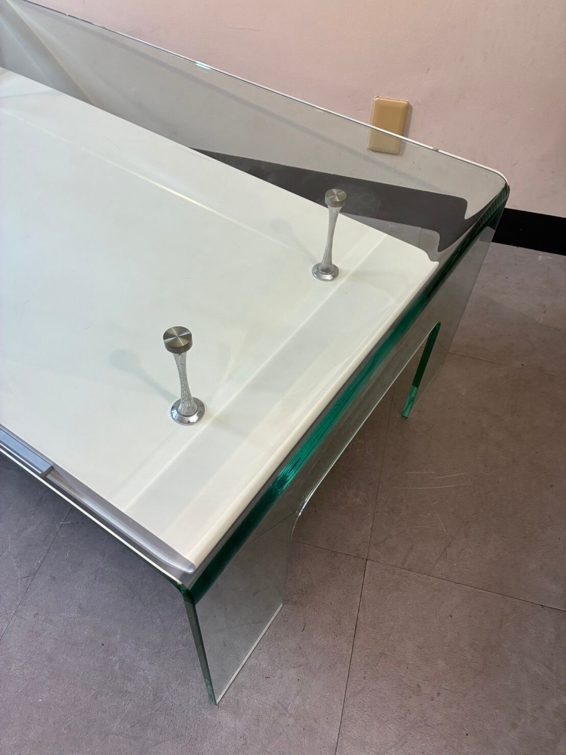 分厚いガラス脚に支えられたホワイトボディが、まるで宙に浮かんでいるかのように見えるデザイン。