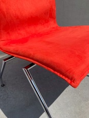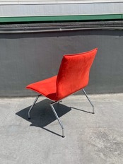 デンマークのデザイナー Bent Krogh によるラウンジチェア。鮮烈なオレンジのファブリックと、細身でシャープなメタルレッグが対比的に映える一脚です。シンプルながらも存在感が強く、空間にモダンなアクセントを与えてくれます。
