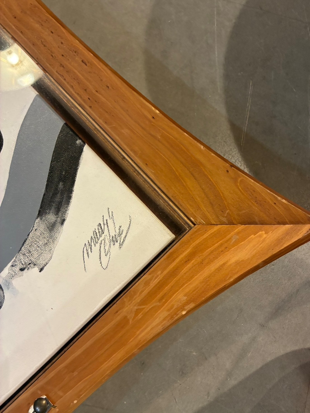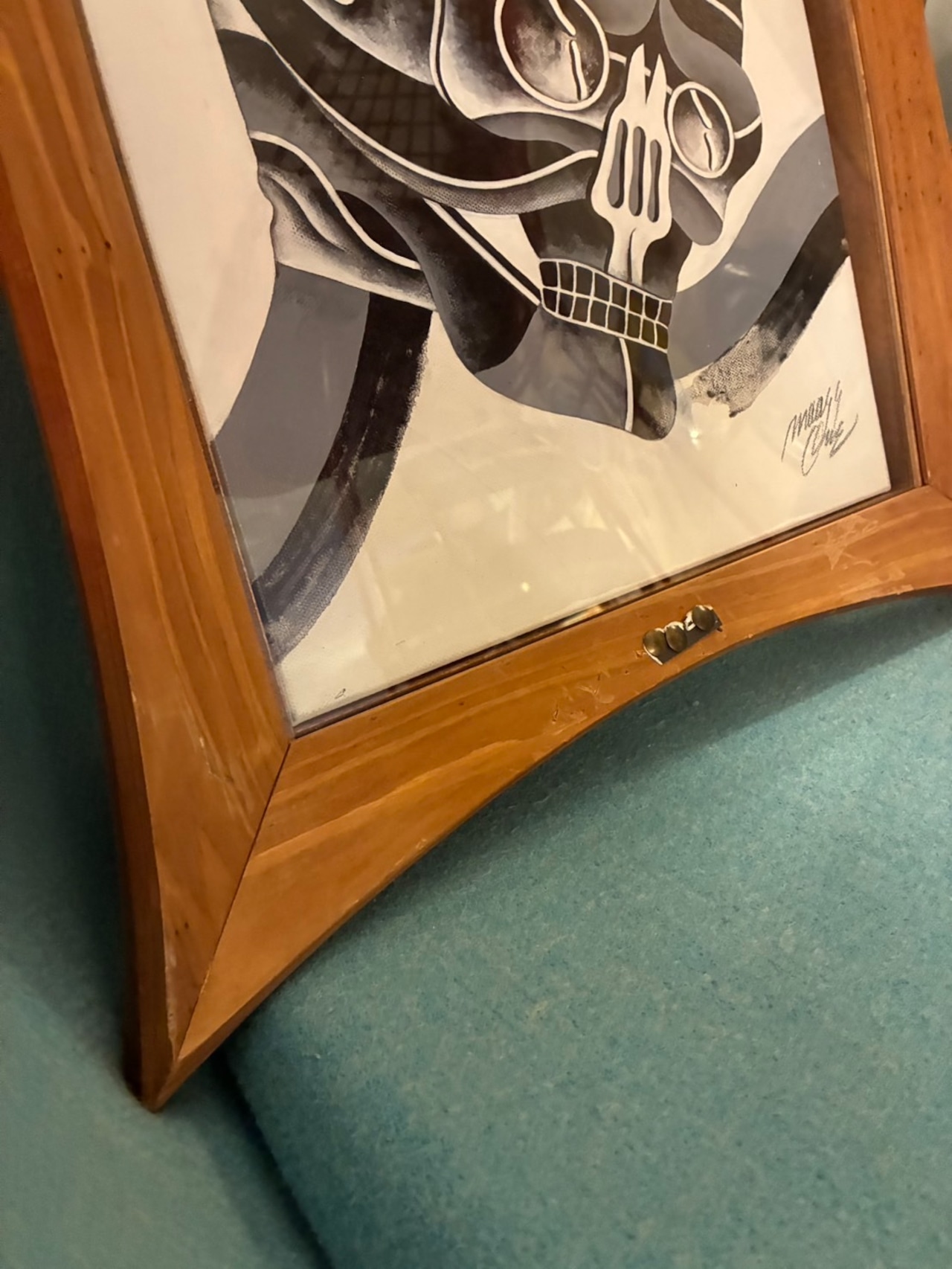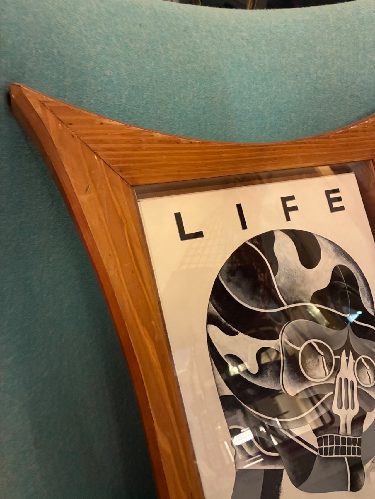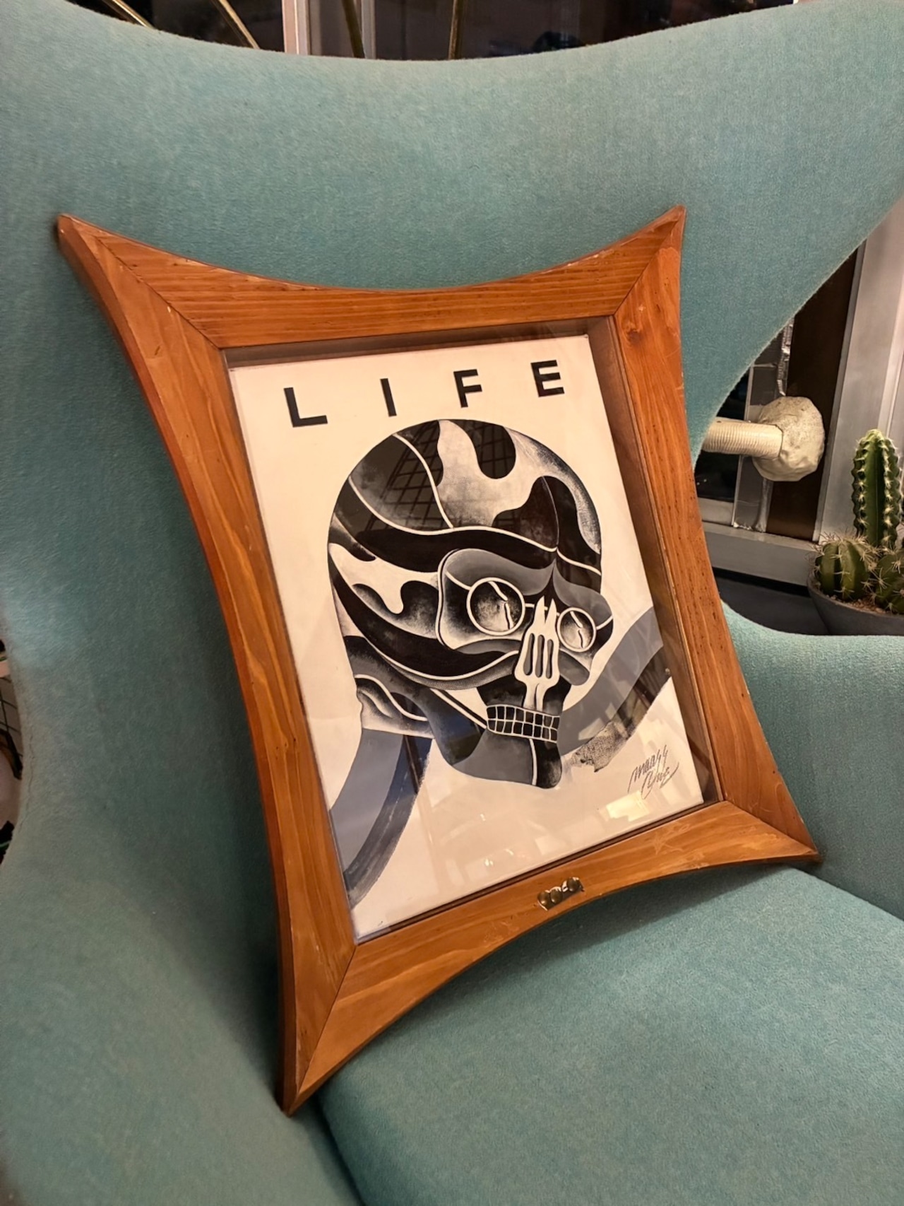 モノクロームの濃淡で描かれたスカルモチーフのオイルペイント。額縁は四隅が張り出した「ひし形」の木製フレーム。単なる器を超えて、作品そのものと共鳴する存在感を放つデザインです。中の絵を入れ替えても良さそう。
