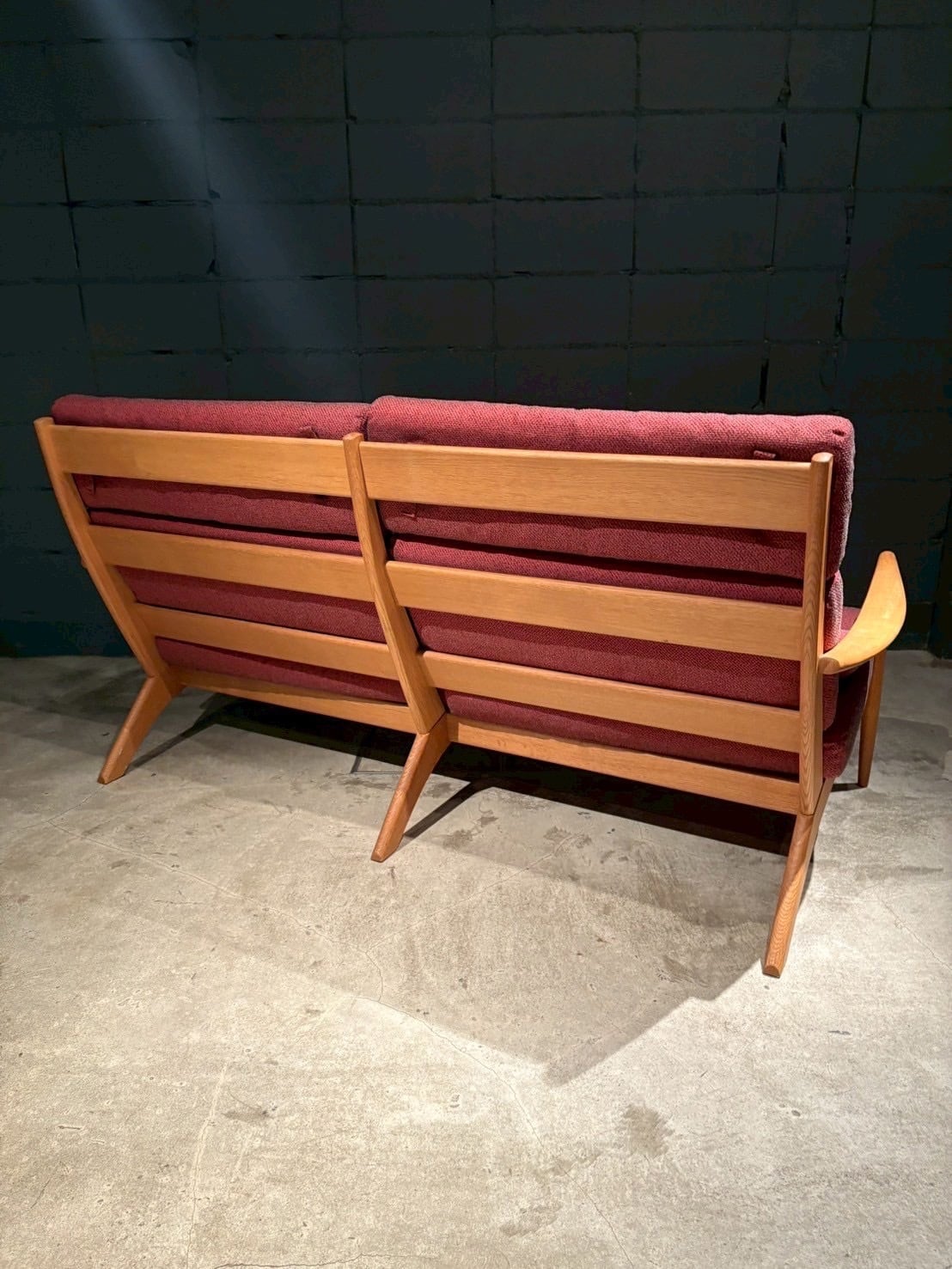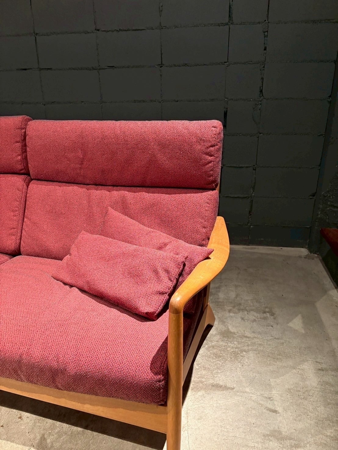 フレームのラインが美しく、木部の温かみとファブリックの質感が見事に調和しています。非常に良好なコンディションです。