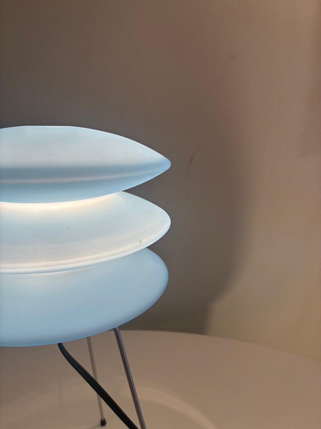 三層のガラスシェードが重なり、宙に浮かぶような光を放つテーブルランプ。