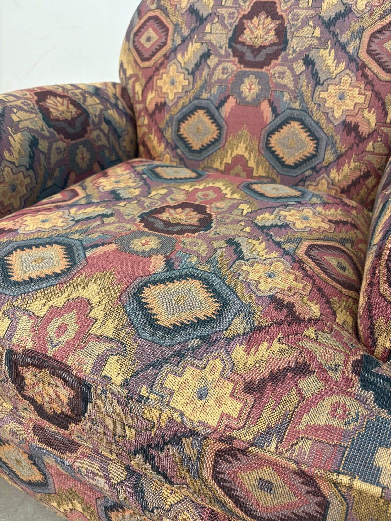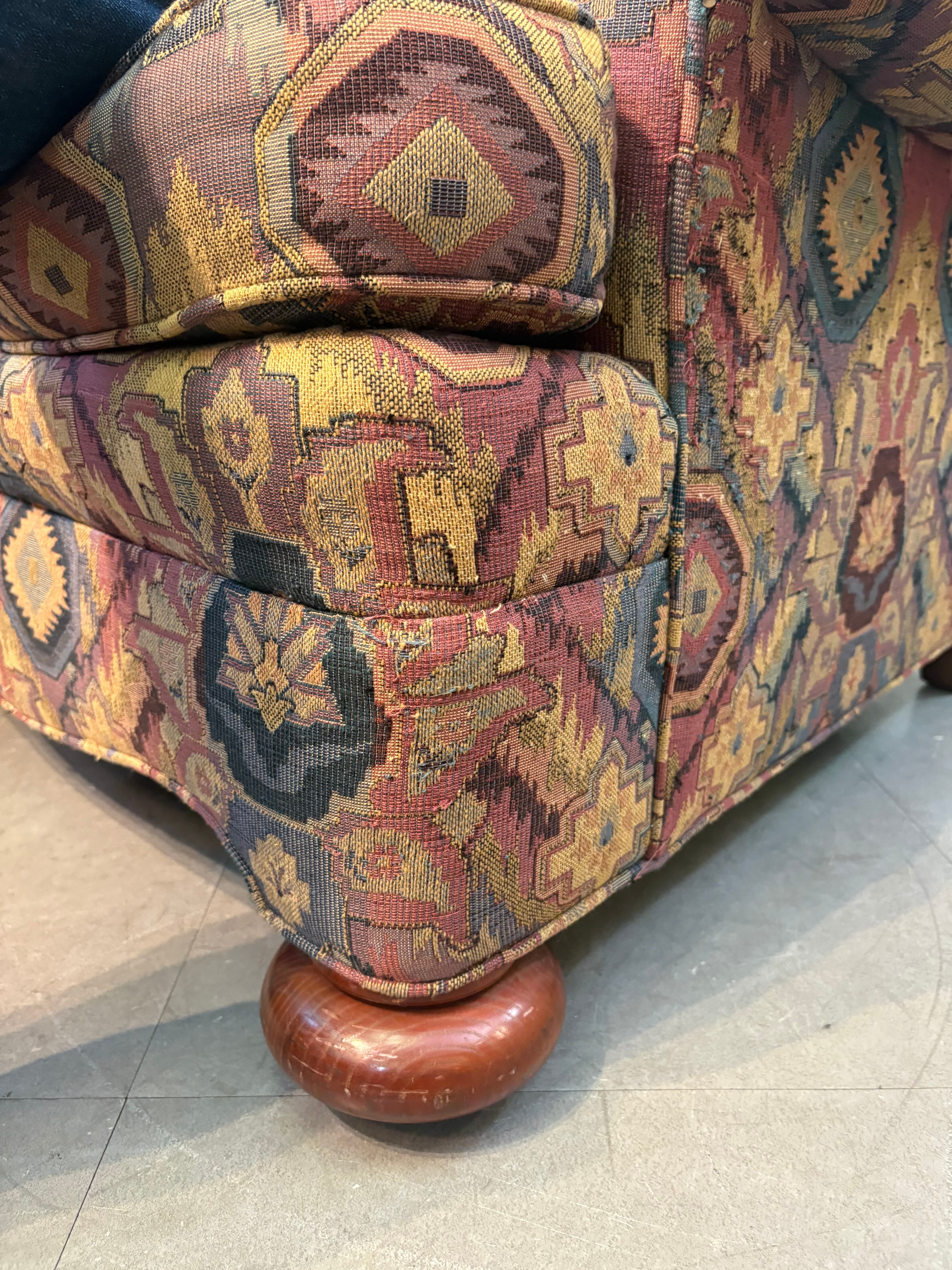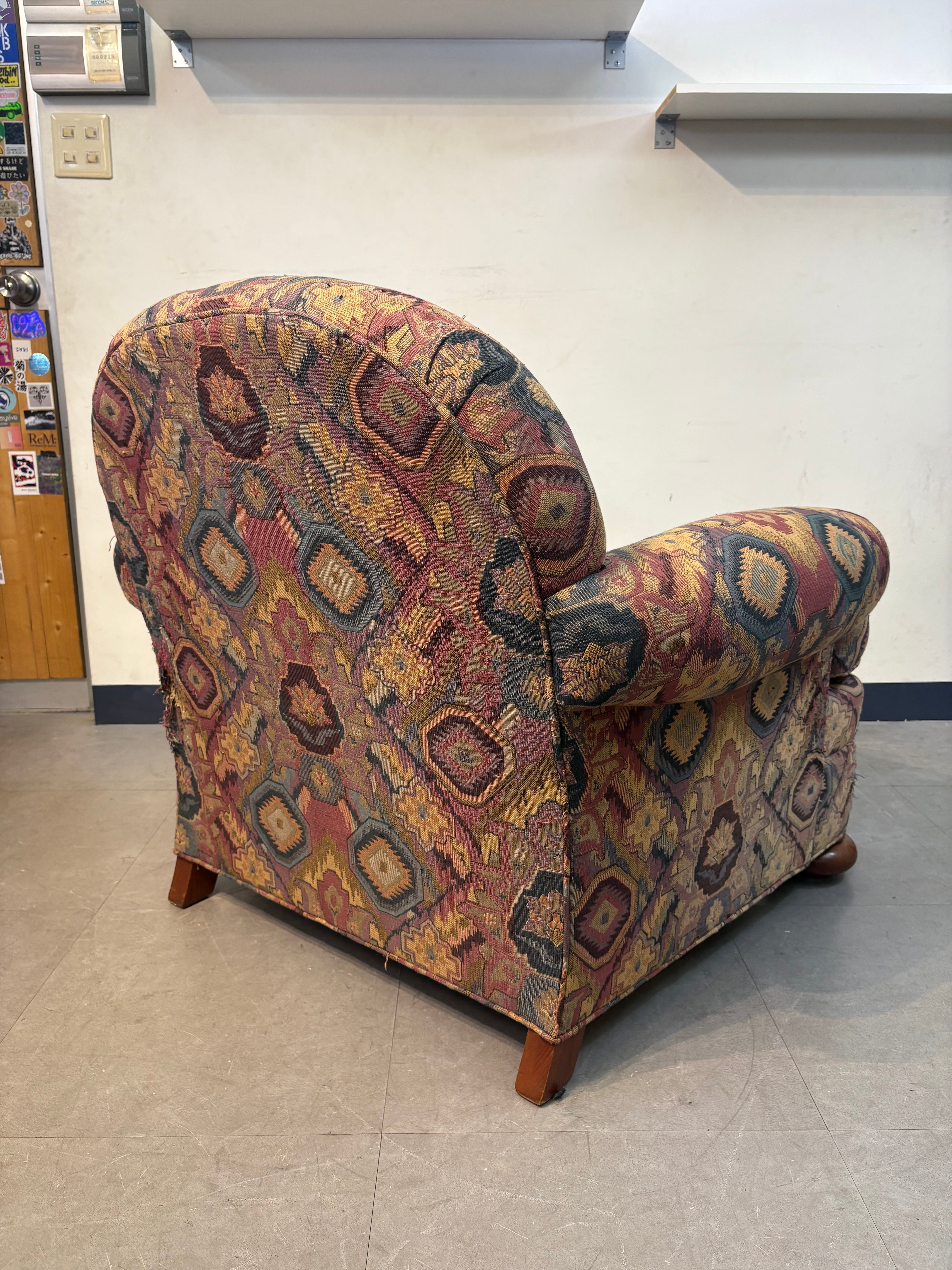 アメリカ・ノースカロライナの老舗高級家具ブランド Hickory White。丸みのあるラウンドフォルムと、90年代らしいイカット調のゴブラン生地が存在感抜群。