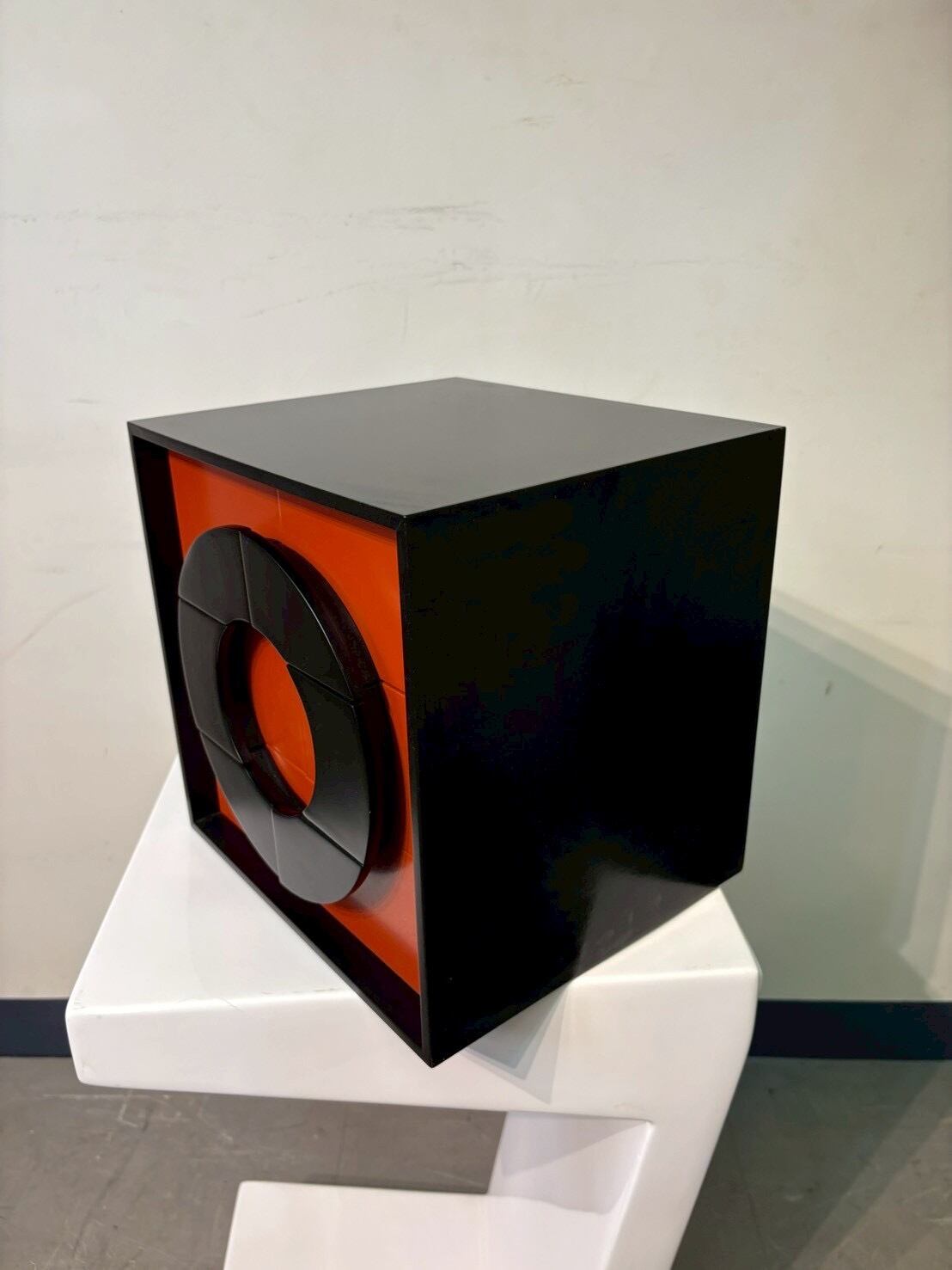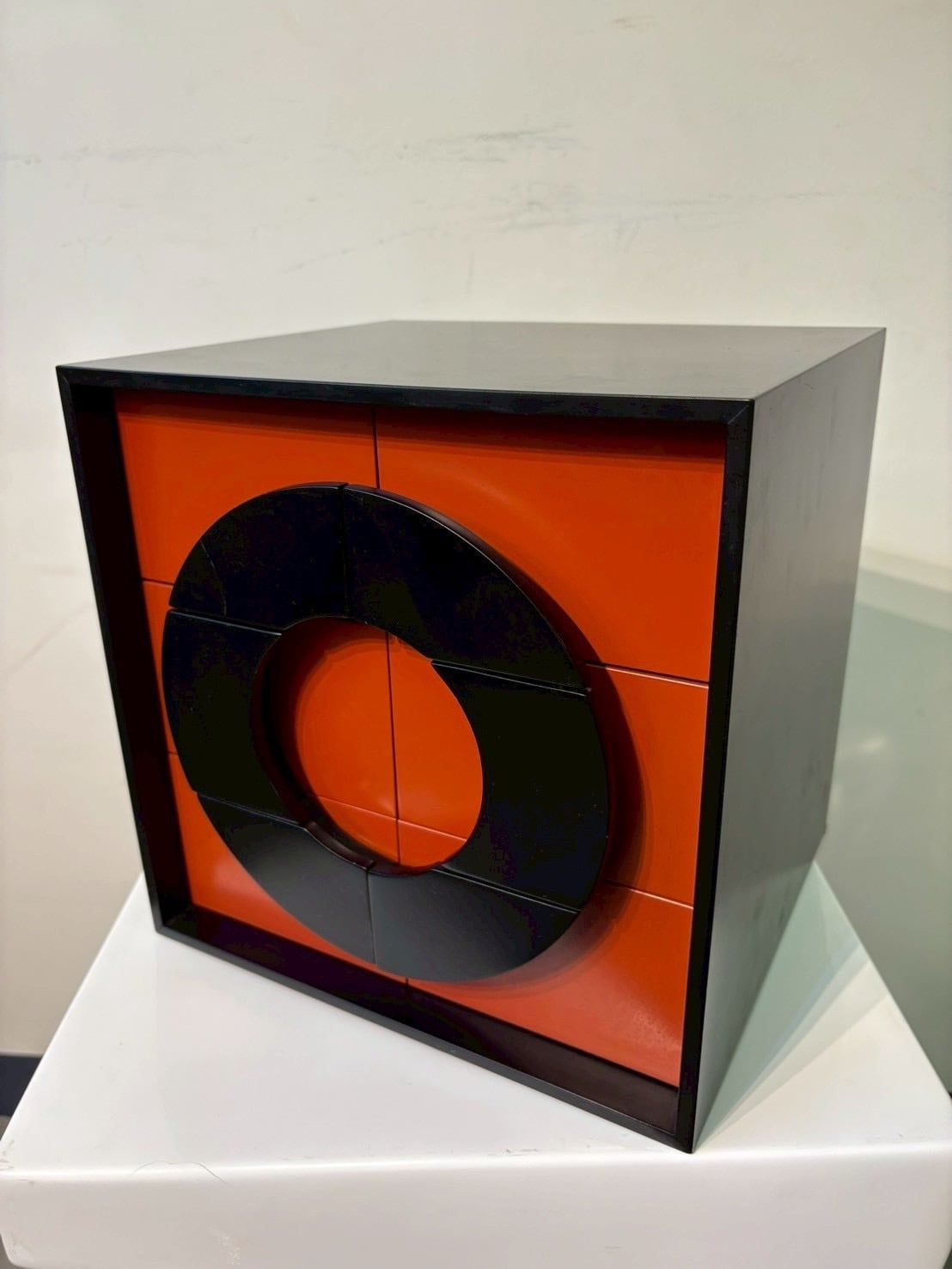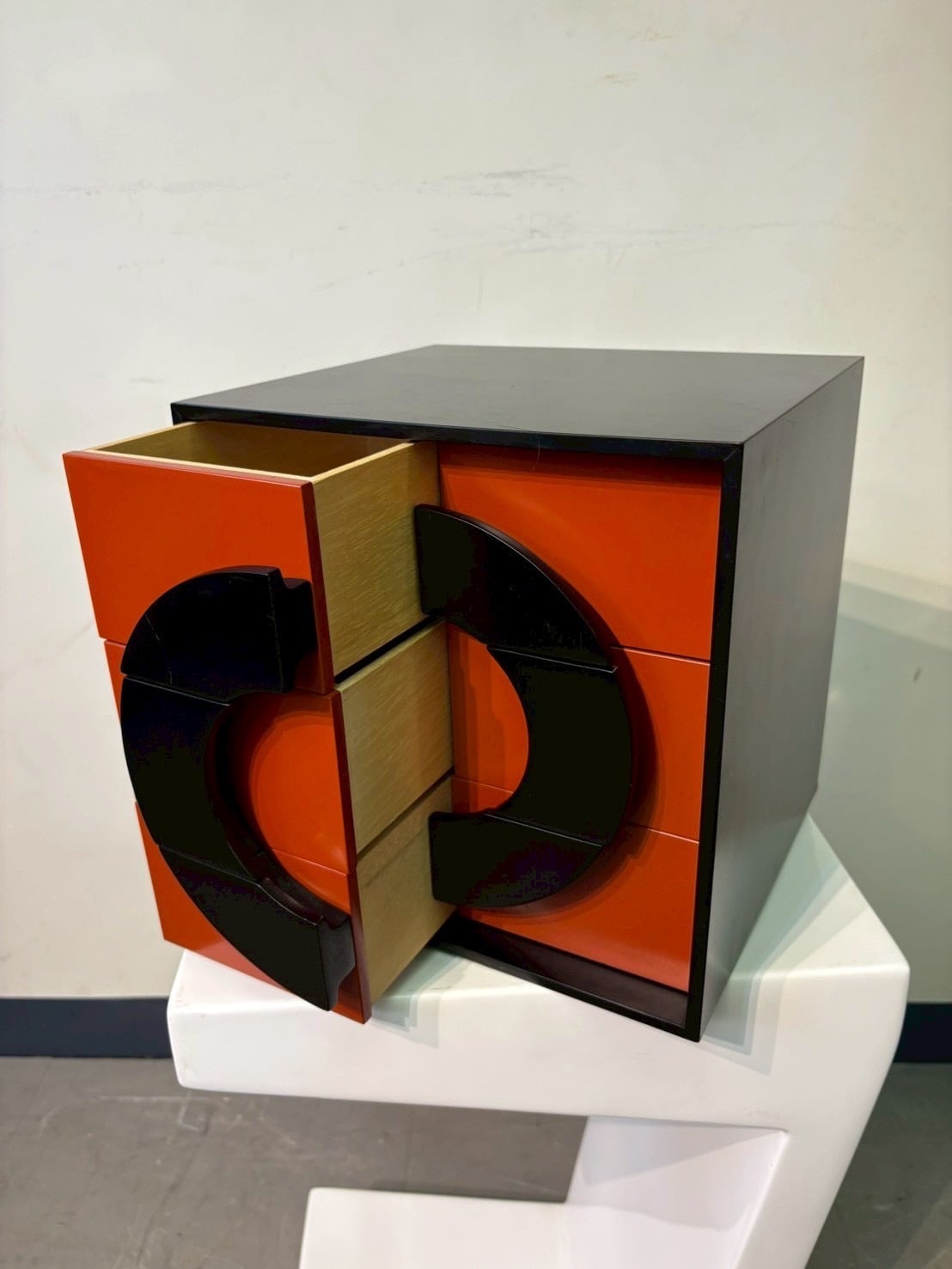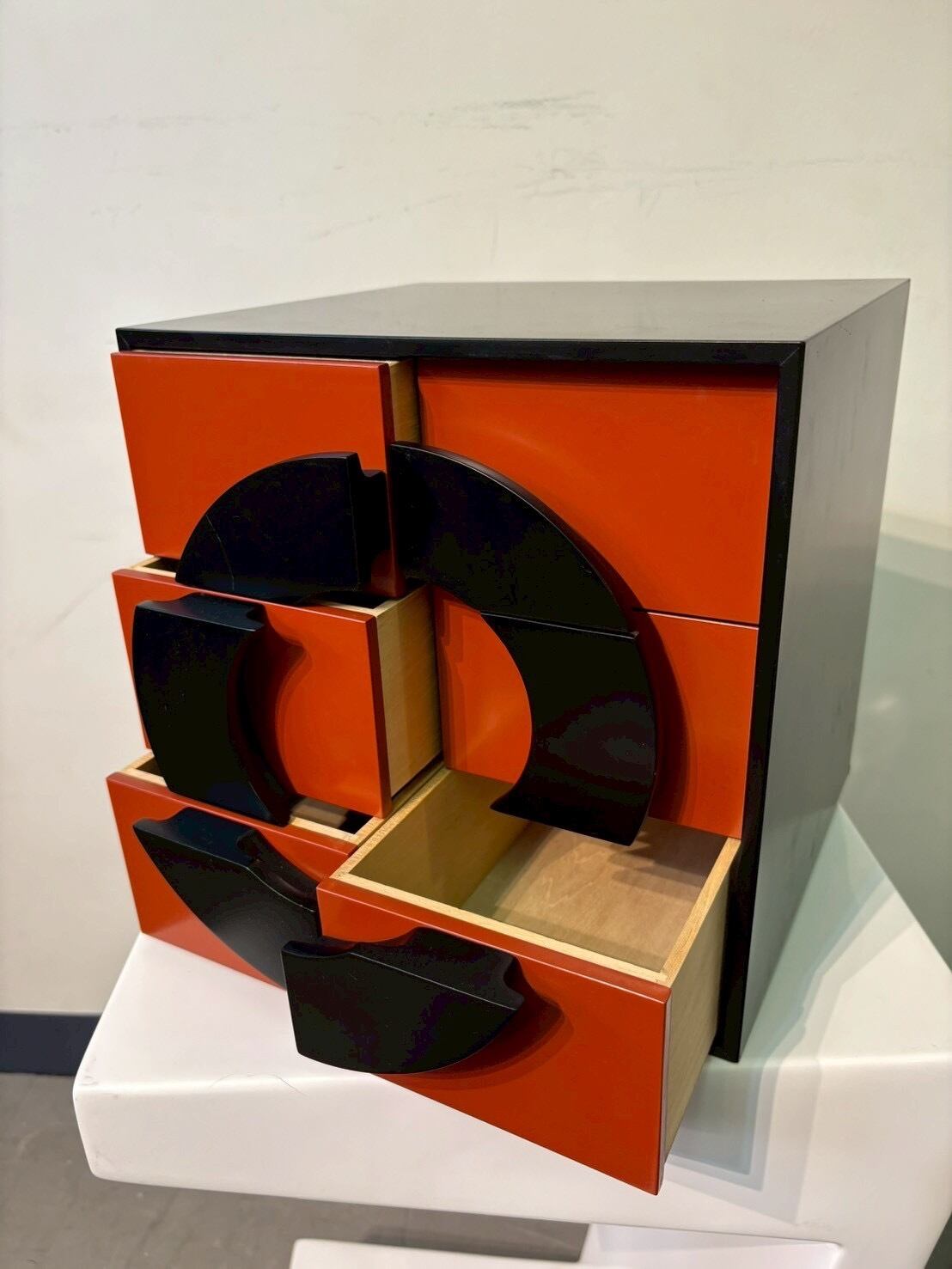 直線のキューブに、フロント全体で大きな円を描くよう配置された分割パネルのデザインが特徴的なポストモダン・ドロワーチェスト。