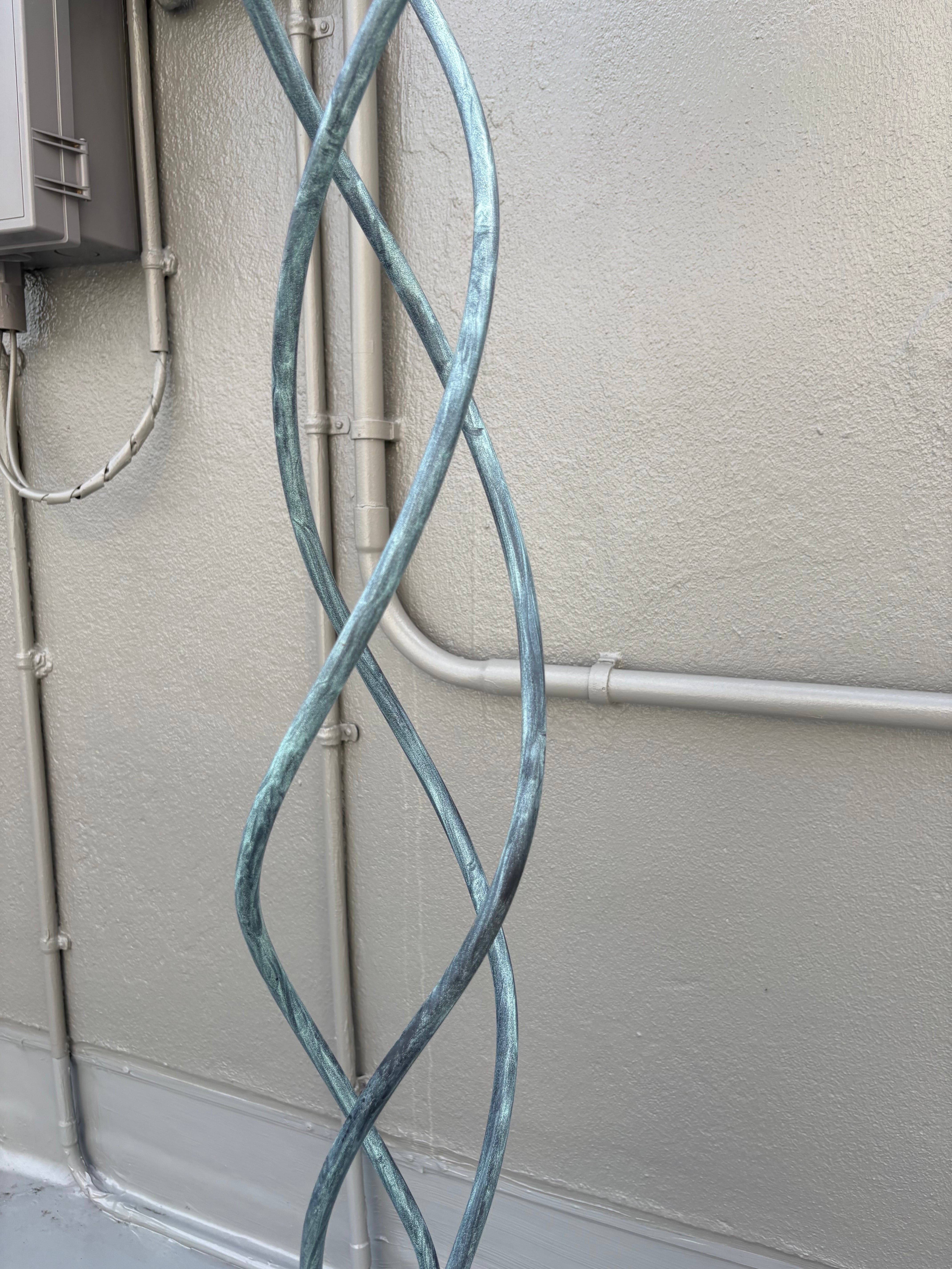 ねじれながら立ち上がるフレームは、照明というより一本の彫刻。