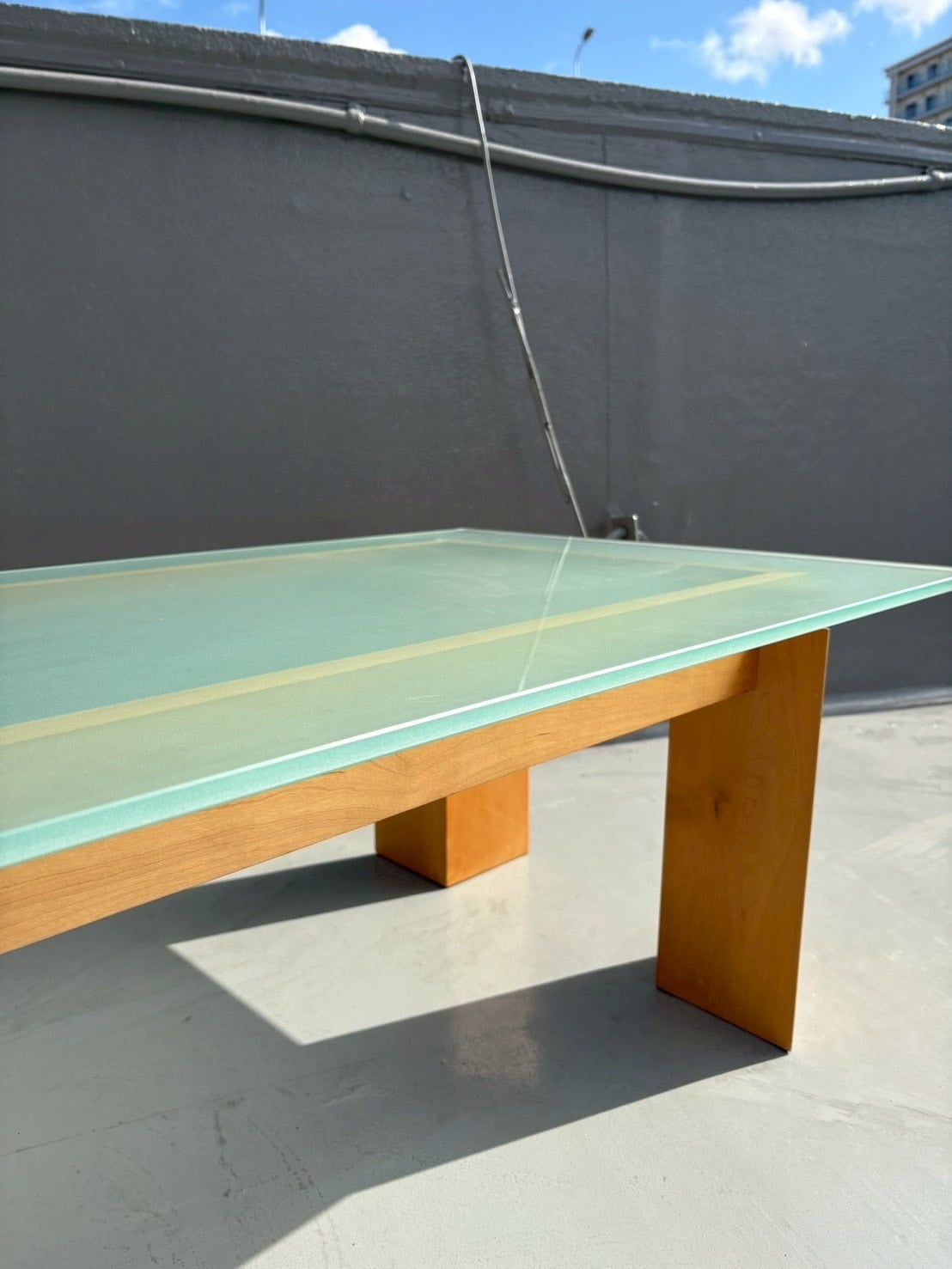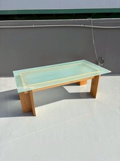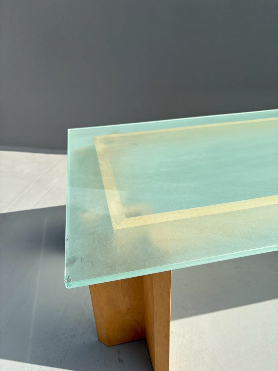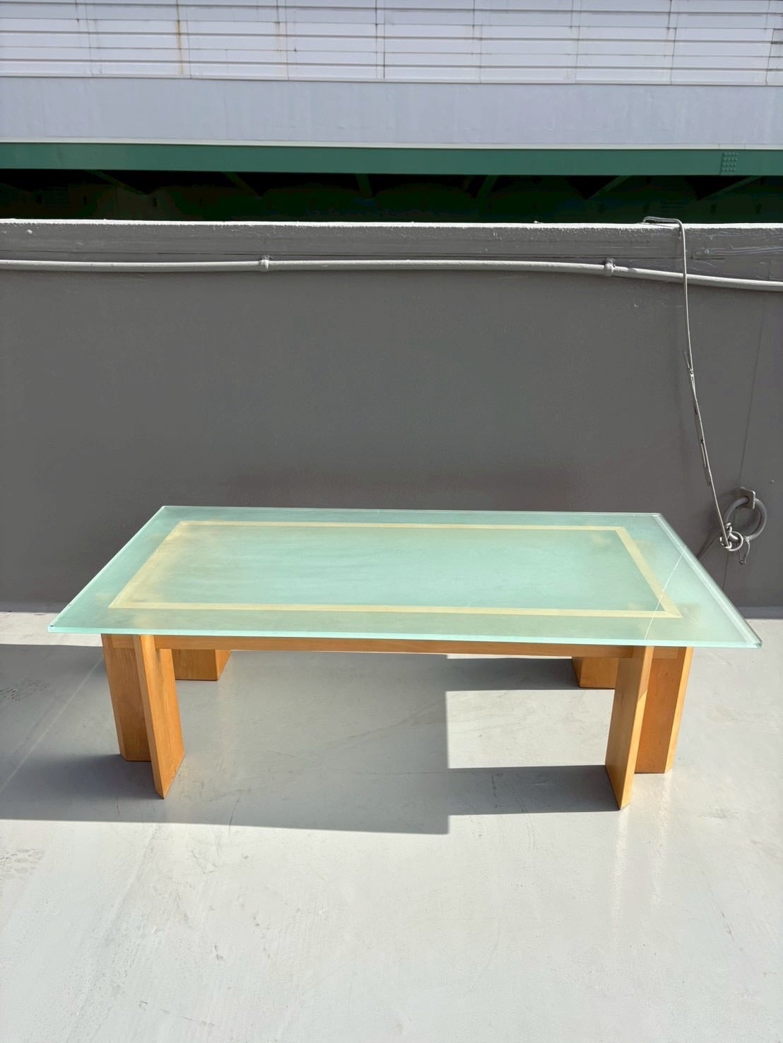 ナチュラルウッドの脚とブルーグリーンのガラス天板で成されるテーブル。