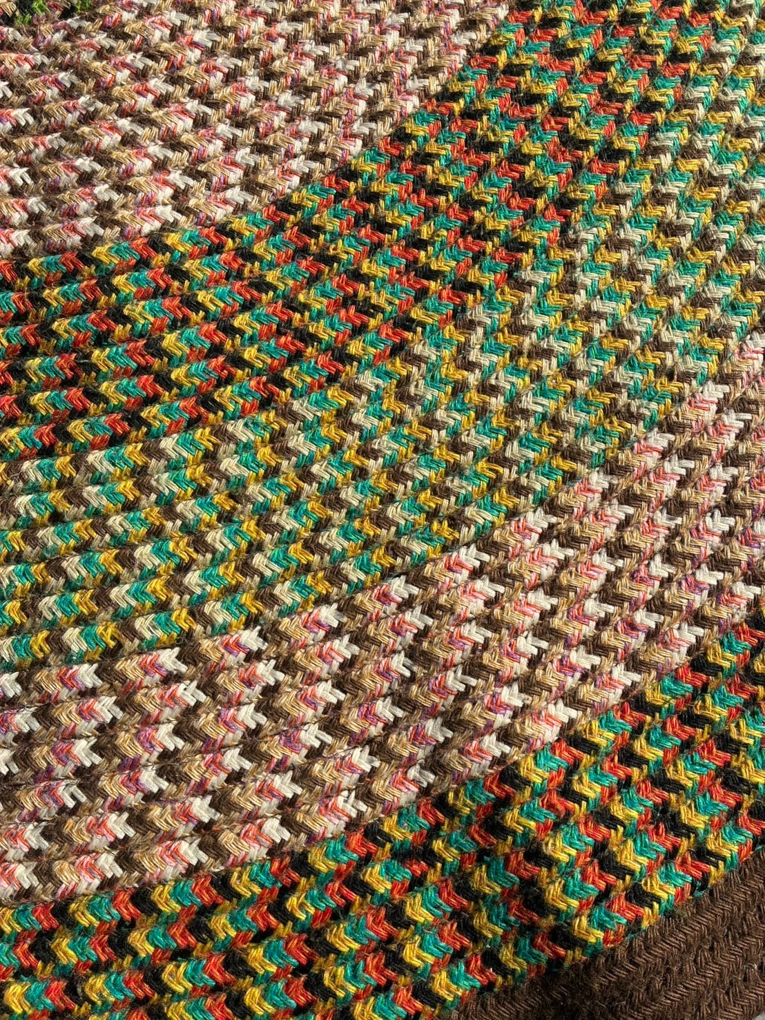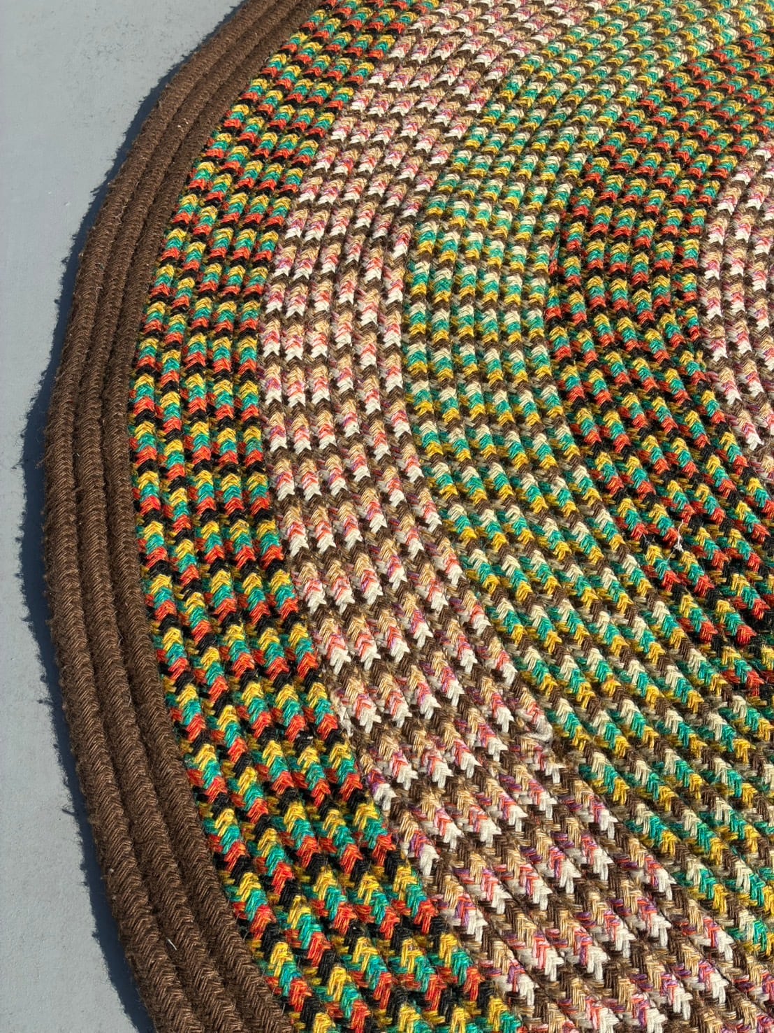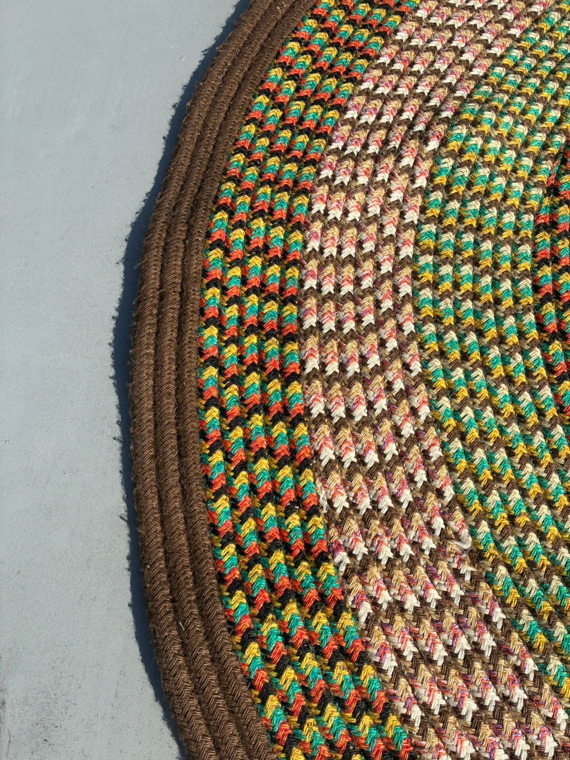 幾重にも編み込まれたスパイラルパターンが印象的な分厚いラウンドラグ。アーストーン×マルチカラーの配色が空間に柔らかい躍動感を与えてくれます。