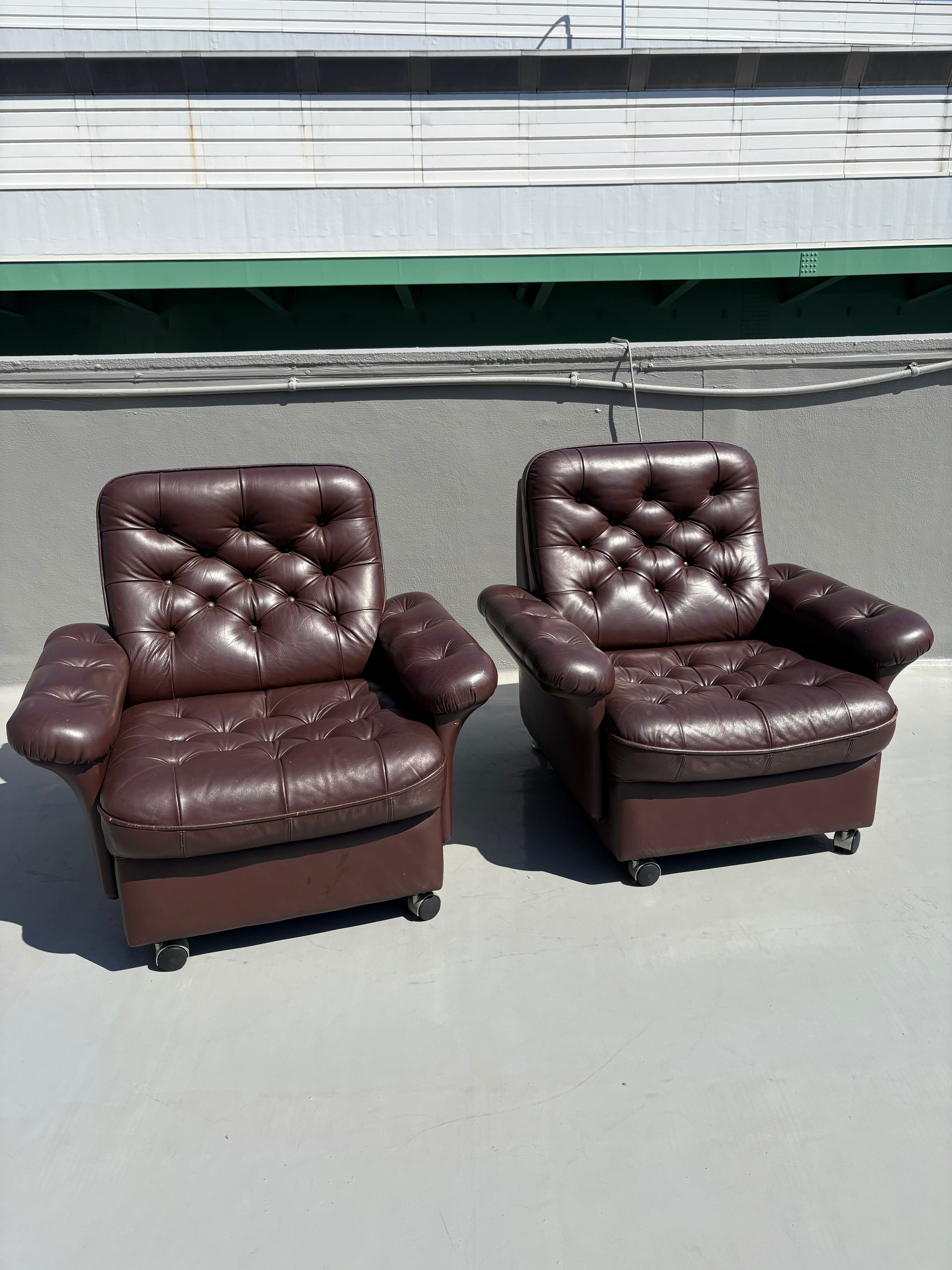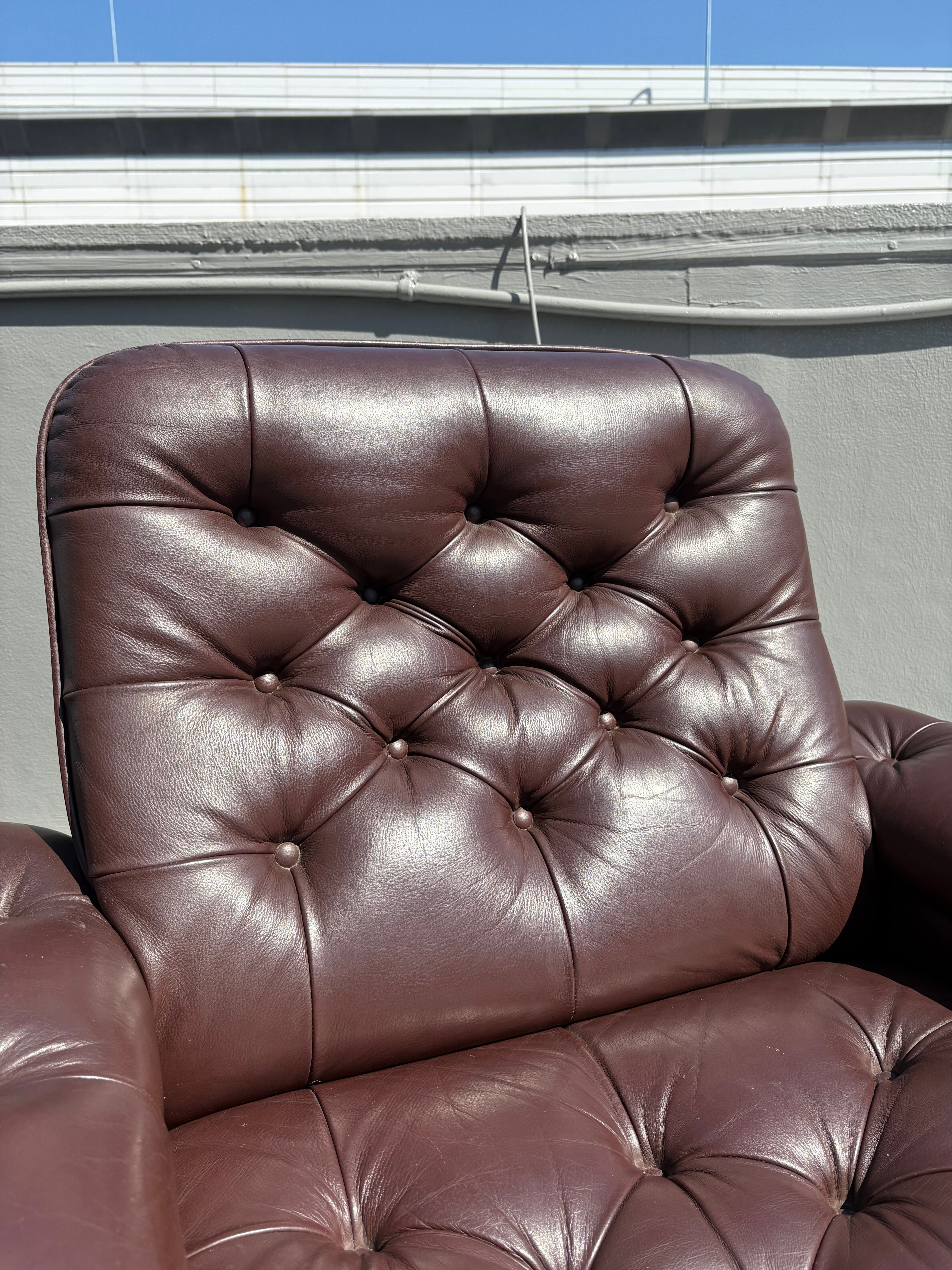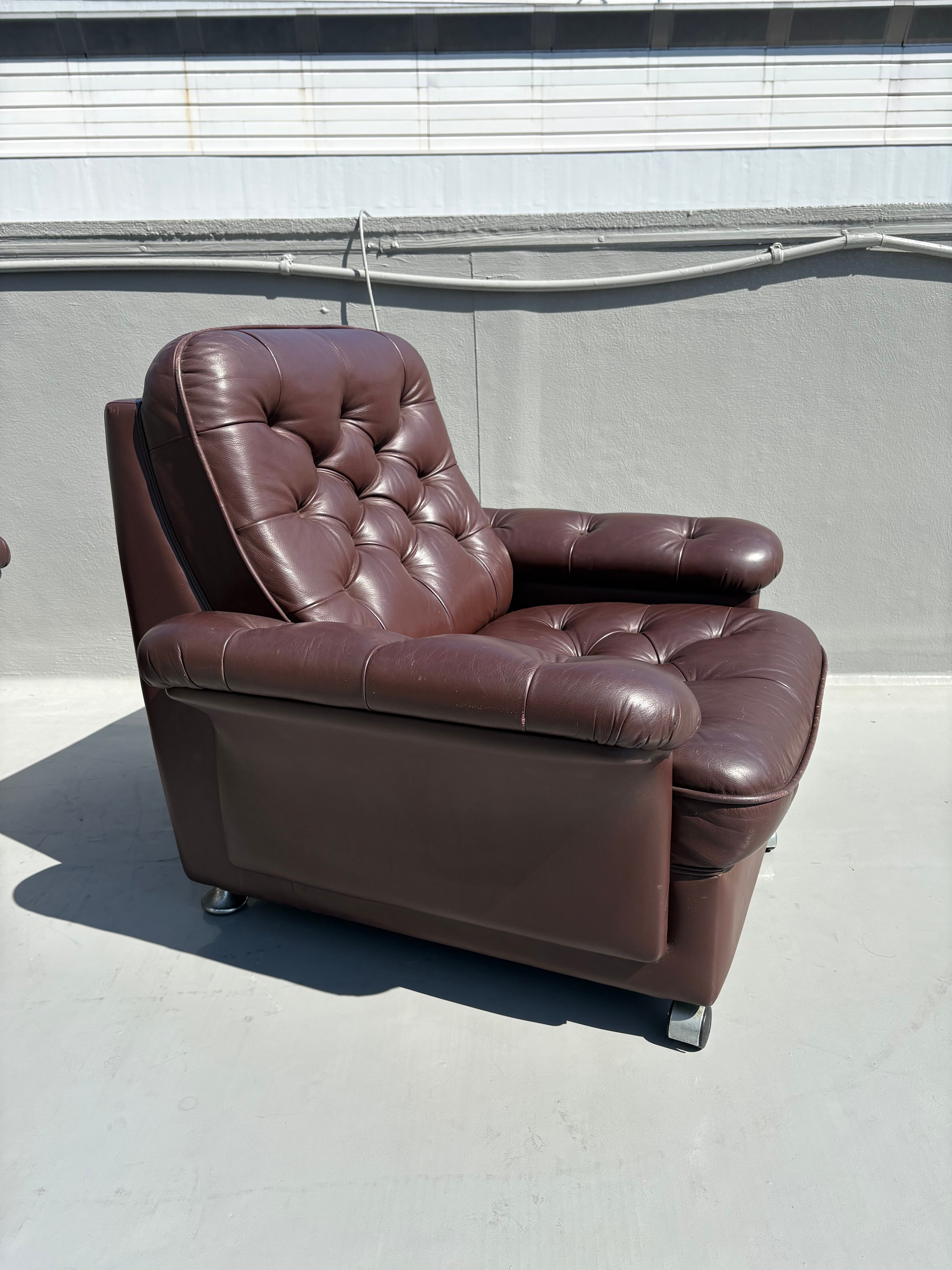 80年代らしいボタン留めクッションと重厚なフォルムが特徴的な1脚。前脚にはキャスター付きで移動もしやすくしっかり沈み込むラウンジ感のある座り心地です。