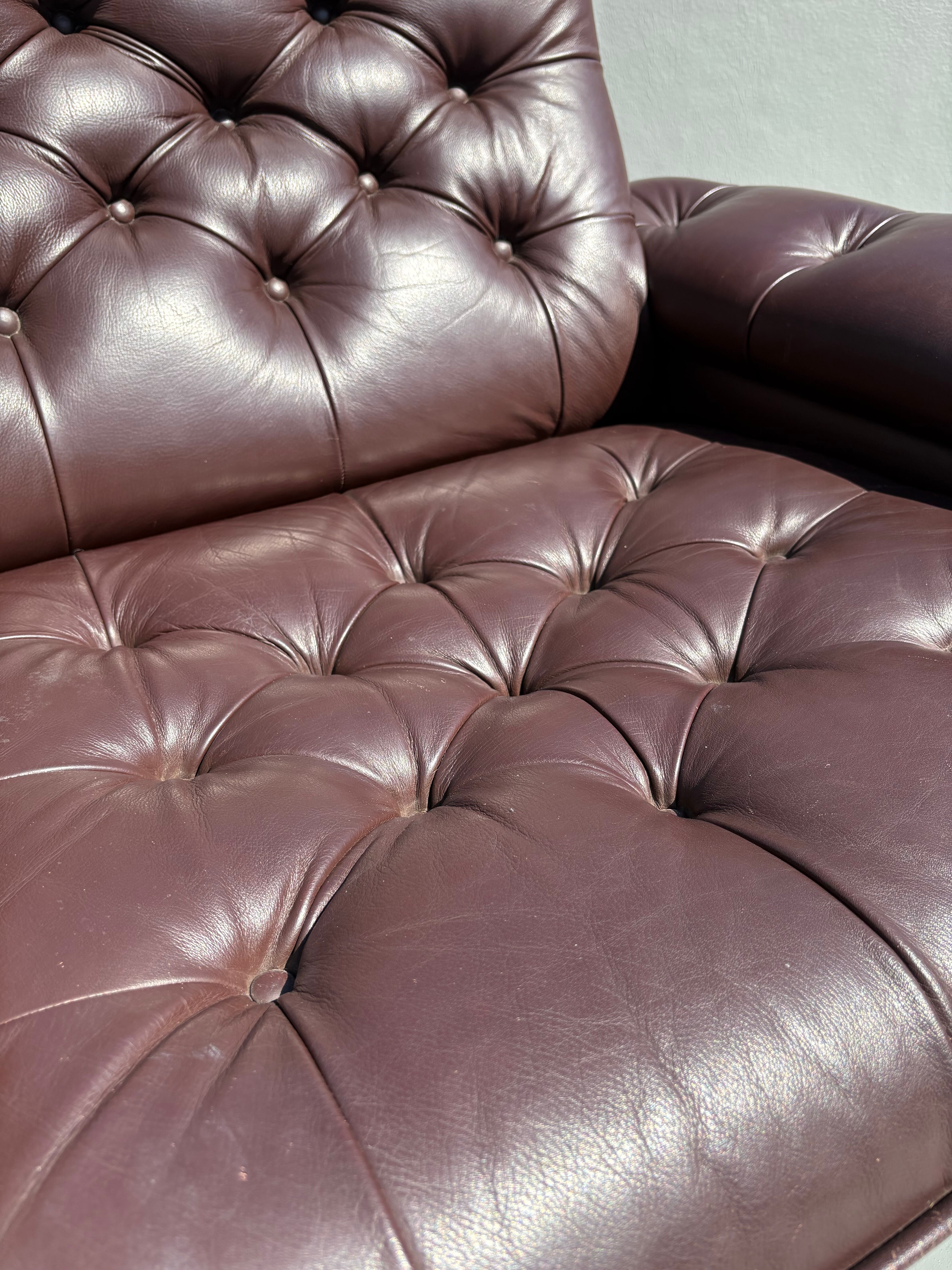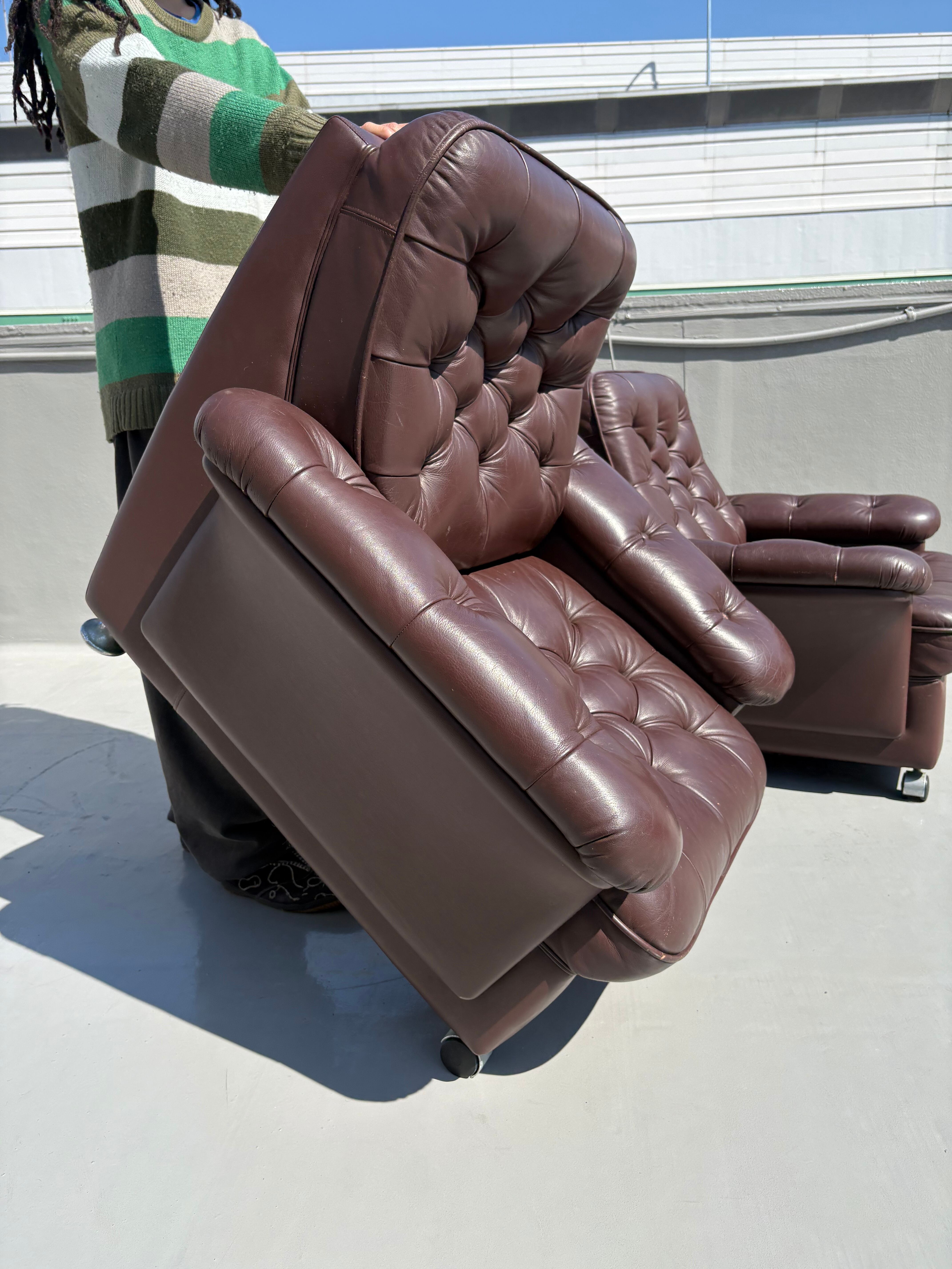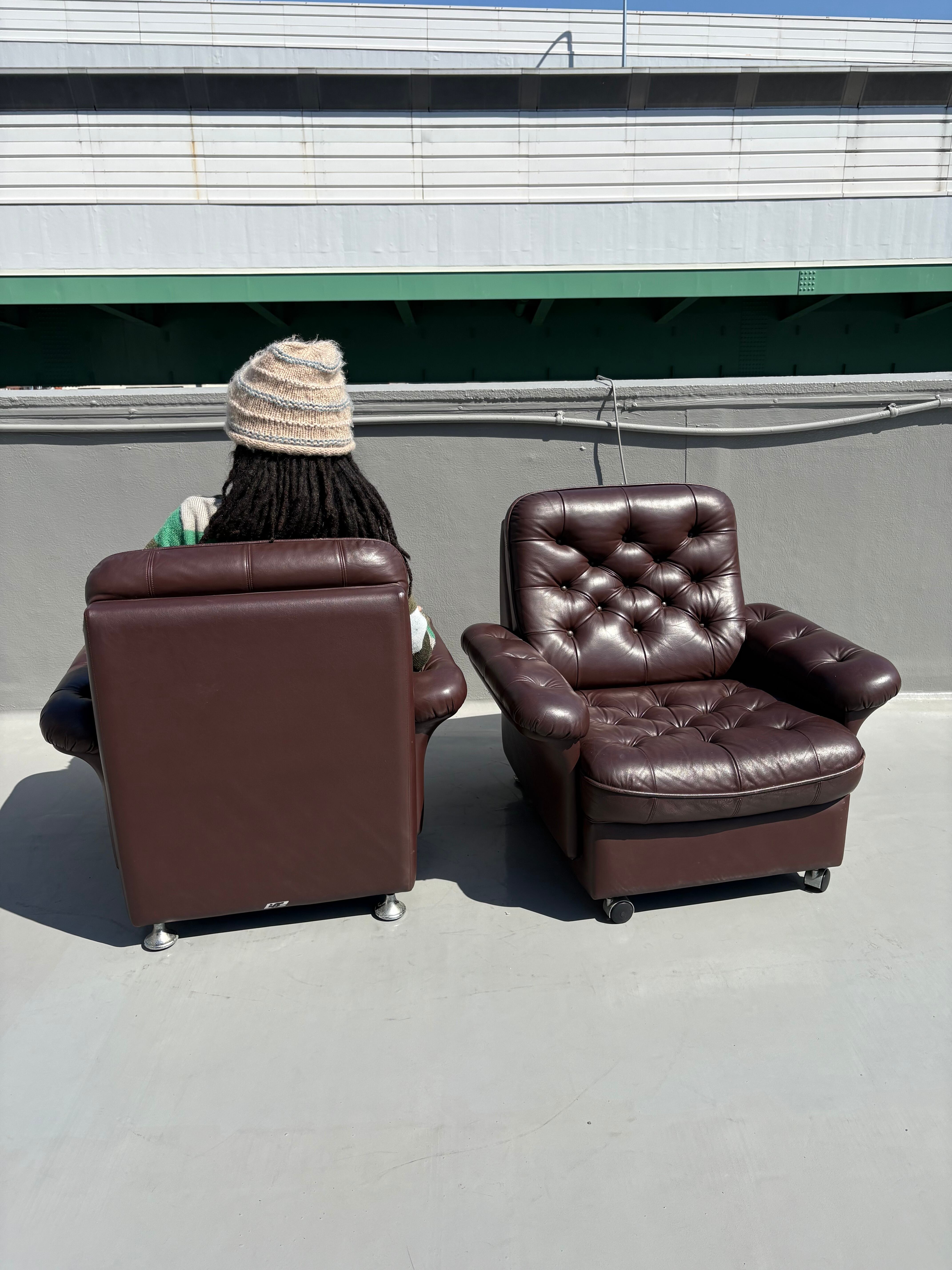 80年代らしいボタン留めクッションと重厚なフォルムが特徴的な1脚。前脚にはキャスター付きで移動もしやすくしっかり沈み込むラウンジ感のある座り心地です。
